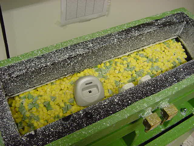 1、测试机器的槽中要装满磨损颗粒,颗粒要混合3份的 RKF 10K(黄色圆锥体)和1份的 RKK 15P(绿色的金字塔体),总共约15升。注意,新的磨损颗粒在使用前,需要在机器上泡至少2升的水中运行 6小时以上,并且运行过程中每半个小时添加0.5升的水。